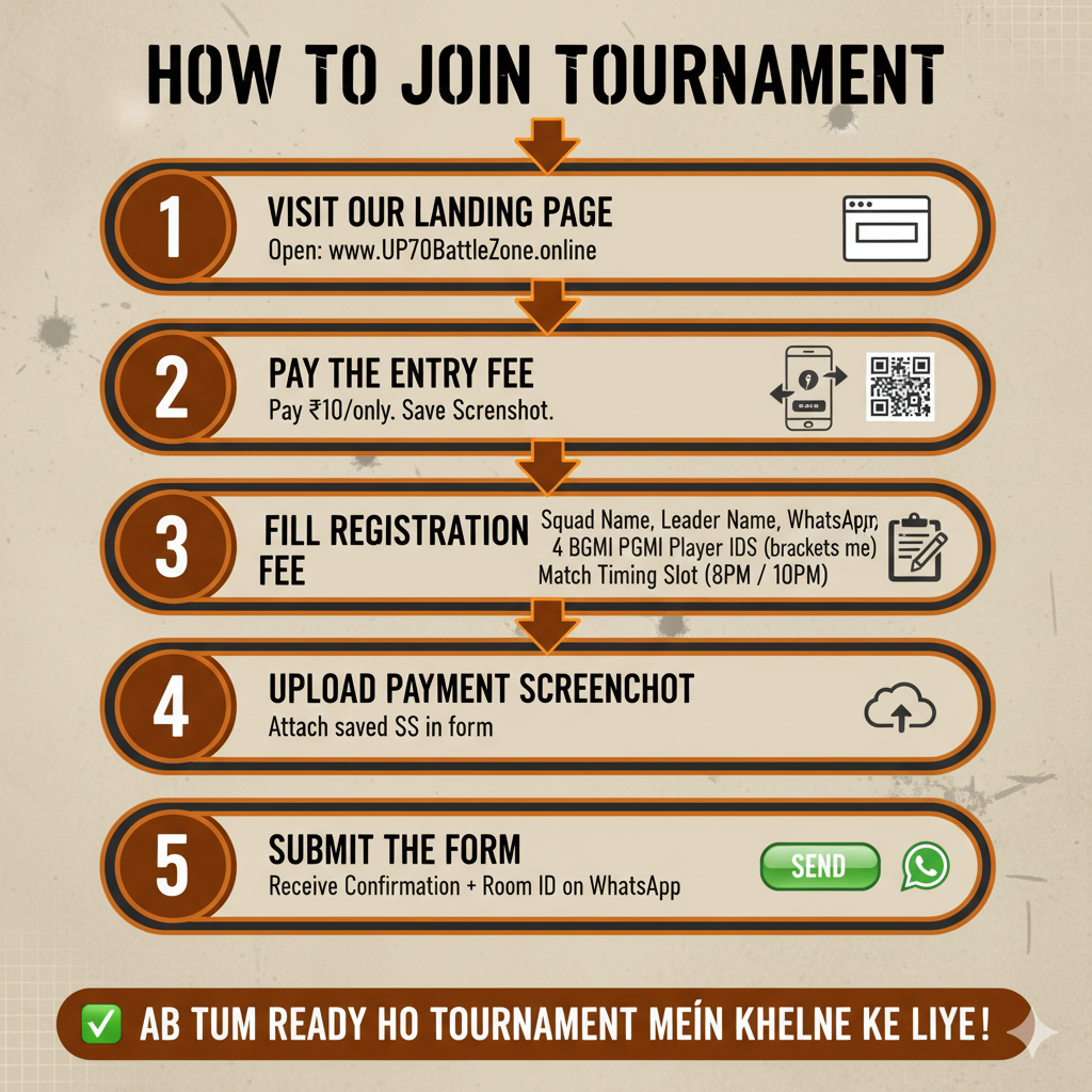 Payment: Squad entry fee βΉ100/squad. Pay via UPI. Player IDs: Enter all 4 player BGMI IDs in bracket (e.g. Player1, Player2, Player3, Player4). Upload: Payment karne ke baad apna screenshot upload karo as proof. Confirmation: Room ID & Password tournament ke 15 min pehle WhatsApp/Telegram group me share kiya jayega.